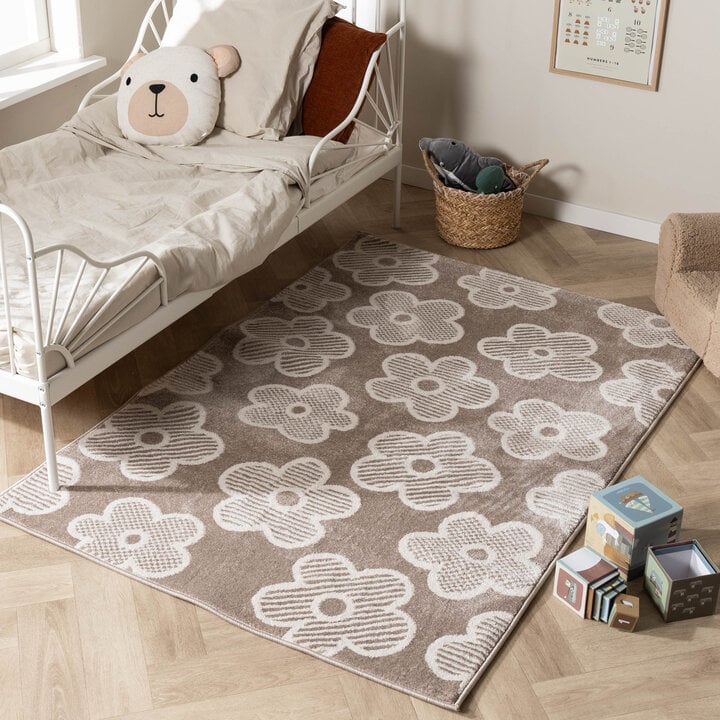 Kinderkamer vloerkleed - Bowie Bloem Taupe is beschikbaar in verschillende maten, namelijk: 80x150cm, 120x170cm en 140x200cm.