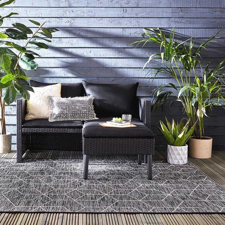 Modern buitenkleed - Liparo Napoli Zwart is beschikbaar in verschillende maten, namelijk: 120x170cm, 160x230cm en 200x290cm.