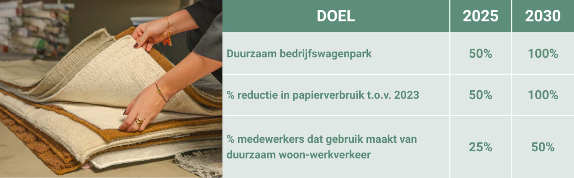 Ook voor klanten maken we bewuste keuzes zichtbaar. Op elke productpagina zie je materialen, certificeringen en onderhoudsadvies om de levensduur te verlengen. Zo kun je bewust kiezen en weet je meteen hoe toekomstbestendig jouw vloerkleed is. Duurzaamheid is bij ons geen losse campagne, maar dagelijkse praktijk.