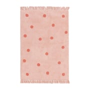 Katoenen vloerkleden kunnen in de eerste dagen wat vezels loslaten. Dat is heel normaal voor dit natuurlijke materiaal en neemt meestal na ongeveer een week af. Licht stofzuigen (met een tapijtborstel en zonder draaiende borstels) houdt het kleed fris en mooi, zodat Lou Dots Roze jarenlang een warme blikvanger blijft in de kinderkamer.