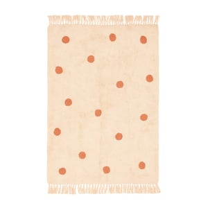 Breng zachtheid en vrolijkheid samen met het vloerkleed kinderkamer - Lou Dots Terra van Little Olly. Dit kindervloerkleed terra voelt alsof je op een wolk stapt, en dat is geen toeval. Dankzij de fluffy, hoogpolige structuur van 100% katoen is het niet alleen heerlijk zacht onder kleine voetjes, maar ook ademend en warm in elk seizoen. De handgetufte afwerking geeft het kleed een volle, levendige uitstraling; elke stip is subtiel voelbaar en nodigt uit om te ontdekken.
