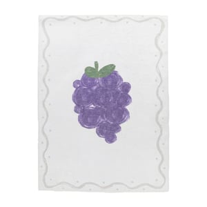 Speels, zacht en een tikkeltje fruitig! Het Wasbaar kindervloerkleed - Mick Druif Paars tovert de kinderkamer om tot een vrolijke speelplek. In het midden schittert een tros paarse druiven, alsof er een klein mandje fruit op de vloer is gevallen. De lichte basis en zachte rand houden het geheel rustig en warm, waardoor dit vloerkleed kinderkamer perfect past in zowel een lieve babykamer als een gezellige speelkamer.