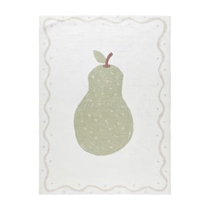 Fris, speels en heerlijk zacht! Het Wasbaar kindervloerkleed - Mick Peer Groen brengt een rustige, natuurlijke sfeer naar de kinderkamer. In het midden ligt een grote groene peer met een klein steeltje, alsof hij zo uit een vrolijke fruitmand is gerold. De lichte basis en sierlijke rand houden het geheel zacht en luchtig, waardoor dit vloerkleed kinderkamer perfect past in zowel een lieve babykamer als een gezellige speelruimte.